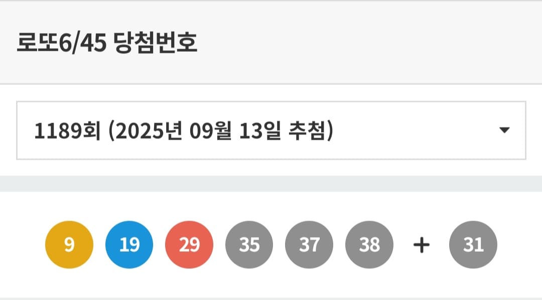 2025년 9월 13일 진행된 제1189회 로또복권 추첨 결과, 1등 당첨번호는 '9, 19, 29, 35, 37, 38'로 결정됐다. 6개 번호를 모두 맞힌 1등 당첨자는 13명으로, 1인당 당첨금은 22억 6,365만 1,299원이다.